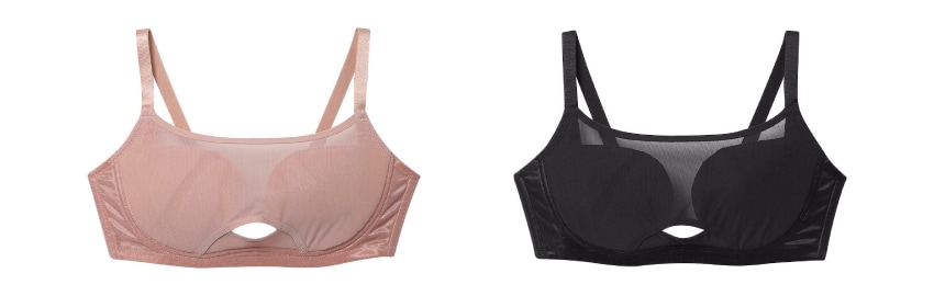 大きい胸さんのためのLAB.研究員のお声「谷間がムレやすい」から開発した、谷間部分はメッシュ1枚で、ムレ感を軽減。さらに、ホールデザインを採用。